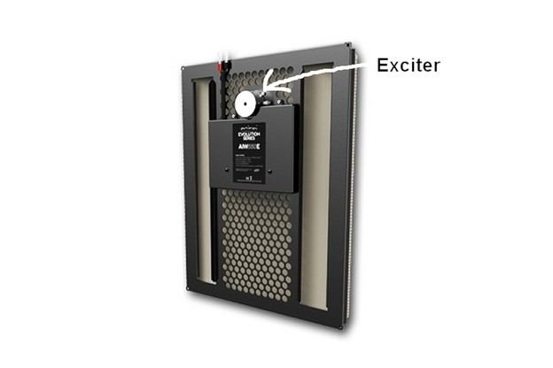 De exciter is gemonteerd op een metalen frame en op het frame zit de afwerkstucplaat.